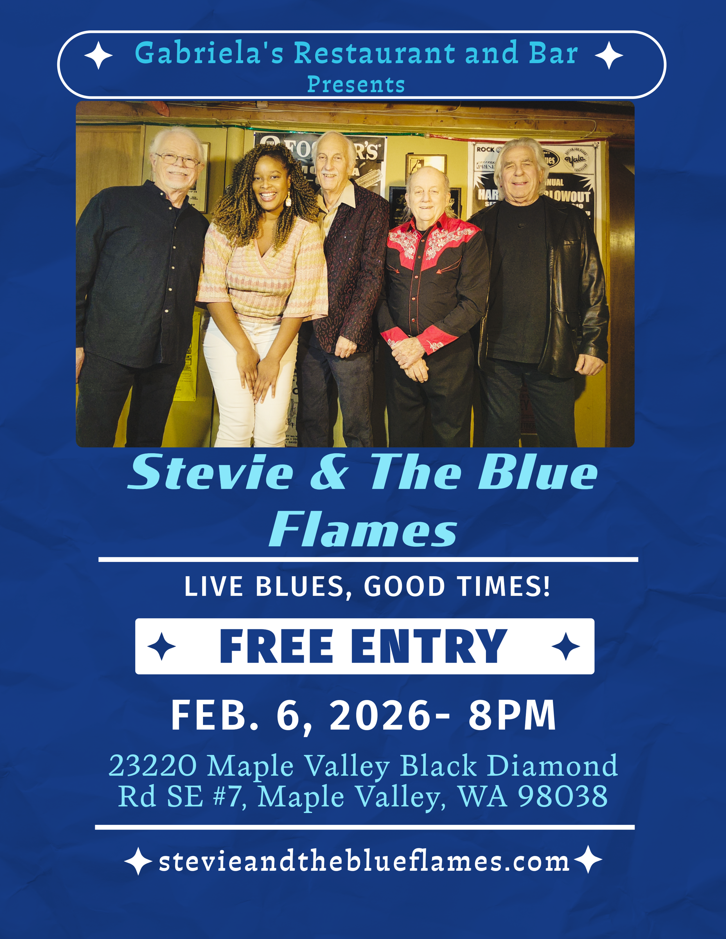 Feb. 6: Gabrielas Restaurant and Bar, 23220 Maple Valley Black Diamond Rd. 8:00